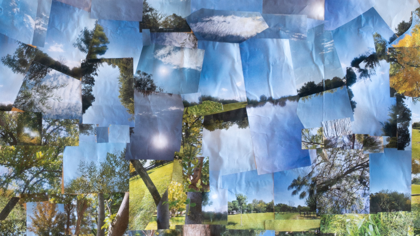 Fragmento del banner de 5 X 4 mts., realizado con collage de fotos realizado en los talleres de fotografía. El collage forma un paisaje natural y será parte central de la exhibición. Foto: Apadim.