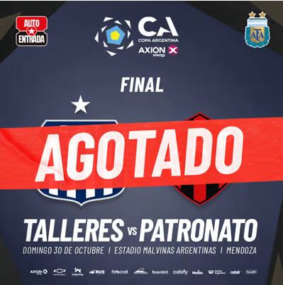 En horas del mediodía, se agotaron las entradas para que los hinchas de Talleres asistan a Mendoza a presenciar la final de la Copa Argentina frente a Patronato. Así se desprende del cartel de “Agotado” que publicaba la página del sitio Autoentrada, encargado de comercializar los boletos.