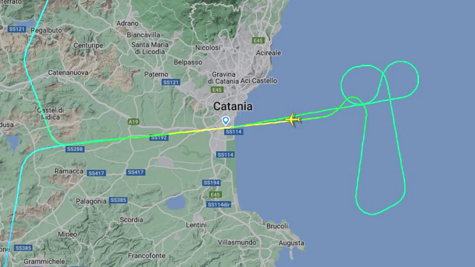 Antes de abandonar el espacio aéreo de Catania, el avión fue visto dirigiéndose hacia el este, hacia la costa siciliana, y volando de tal forma que la trayectoria creaba la forma de unos genitales masculinos, según las imágenes del sitio de tráfico aéreo Flight Radar.