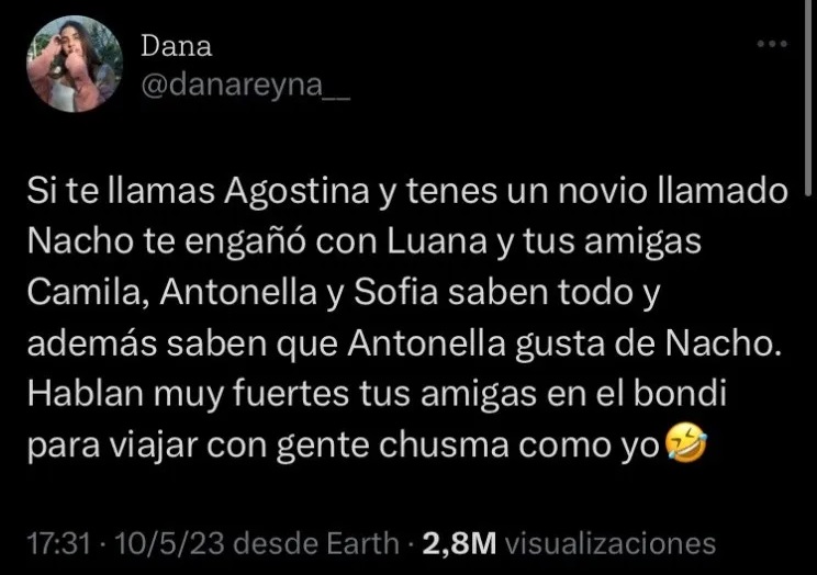 La usuaria de TikTok “agosrodellone” se topó con un tuit en el que otra usuaria de Twitter escribió que escuchó, mientras viajaba en el colectivo, que a una tal “Agostina” que tenía un novio llamado “Nacho” la estaban engañando con “Luana”. “Tus amigas Camila, Antonella y Sofía saben todo, y además saben que Antonella gusta de Nacho”, redactó la usuaria de Twitter.