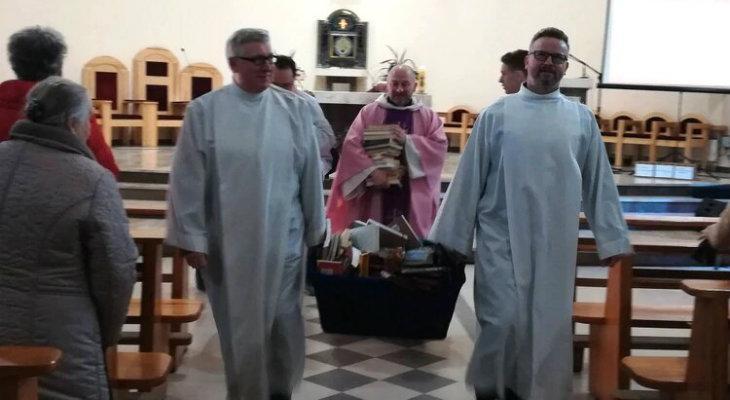 En las fotografías se ve a tres sacerdotes que van por los pasillos de una iglesia y luego hacia un foco de fuego al aire libre con una canasta llena de libros. Además de libros, se destruyeron otros objetos como máscaras de tipo africanas, un paraguas «Hello Kitty» y una figura hindú.