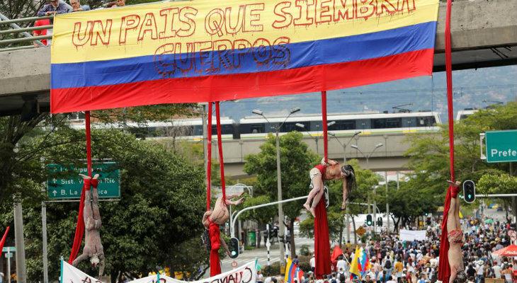 La movilización convocada por celebridades, colectivos y ONGs replicó la masiva respuesta del primer concierto itinerante Un canto por Colombia”, que tuvo lugar en Bogotá el 8 de diciembre. Artistas y público al unísono han pedido a viva voz justicia, igualdad, paz y soluciones urgentes a los problemas que aquejan al país”, señalaron los organizadores al cerrar la jornada, que terminó sin incidentes. Lo que buscamos es que el Gobierno escuche todas las peticiones de la ciudadanía”, agregó Faber Ramírez, del Comité Gestor de Artistas, mientras que la cantante Adriana Lucía aseguró que si tuviéramos que poner en una hoja todo lo que pedimos, no cabría: hay mucho descontento, la gente está molesta, tiene rabia, está herida”. Una de las particularidades de la protesta estuvo en una puesta en escena donde cuatro personas se colgaron desnudas y aparentemente ensangrentadas de telas rojas prendidas de uno de los puentes de la céntrica avenida San Juan (foto).