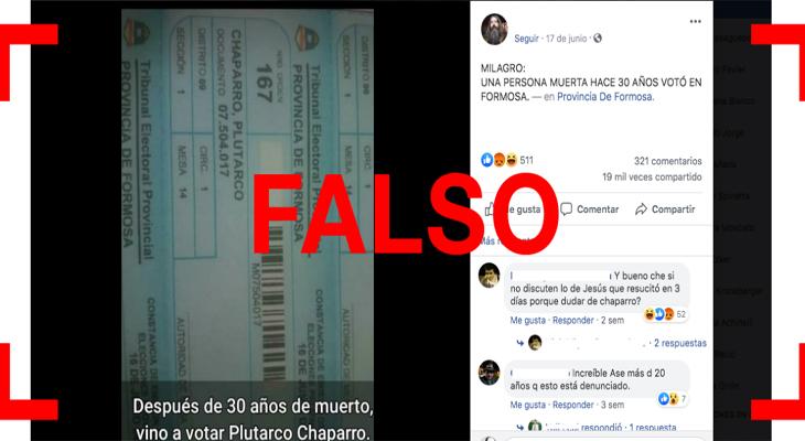 Circula en Facebook una publicación en la que se ve el padrón electoral de la provincia de Formosa con los datos de una persona llamada Plutarco Chaparro. La imagen está acompañada del siguiente texto: “MILAGRO: UNA PERSONA MUERTA HACE 30 AÑOS VOTÓ EN FORMOSA (sic)”. Sin embargo, esto es falso: Chaparro efectivamente falleció, pero no se emitió ningún voto en su nombre, según confirmaron el Tribunal Electoral Provincial y la Cámara Nacional Electoral a Reverso.