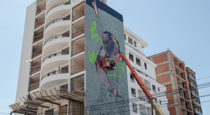 Desde el pasado jueves, se encuentra trabajando en la ciudad sobre una medianera de un edificio de altura ubicado en avenida Pueyrredón, en la zona de barrio Observatorio.