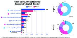 Un dato del informe judicial que impacta es que el 52% de las causas penales contra jóvenes de 2022 fue por un delito contra la propiedad. En tanto, en el 14% de las detenciones fue por delitos contra las personas; mientras que el 12% fue por delitos contra la administración pública; el 10%, delitos contra la libertad, y el 7%, contra la integridad sexual, entre otras cuestiones.