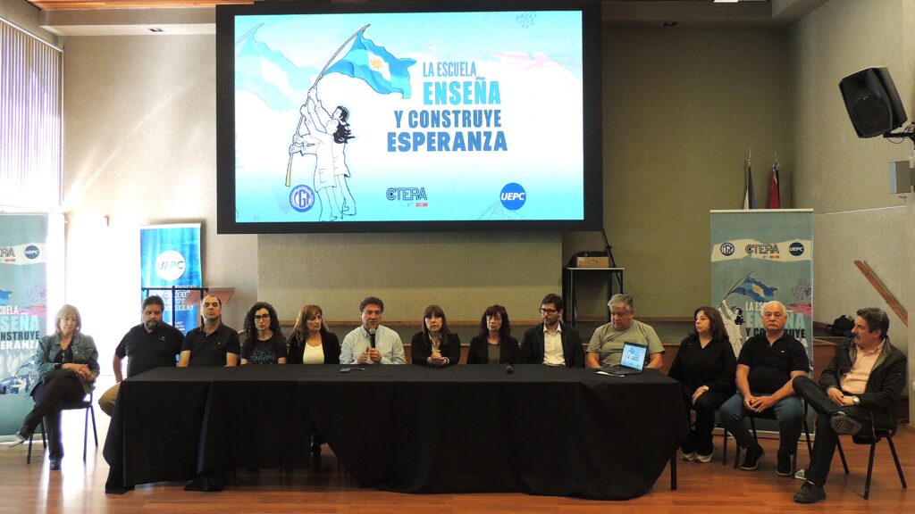 El secretario general de la UEPC,Roberto Cristalli, encabezó este martes una conferencia de prensa en la que anunció la realización de una caravana provincial mañana miércoles y un paro nacional docente el próximo martes 14 de octubre, con una movilización en la ciudad de Buenos Aires.